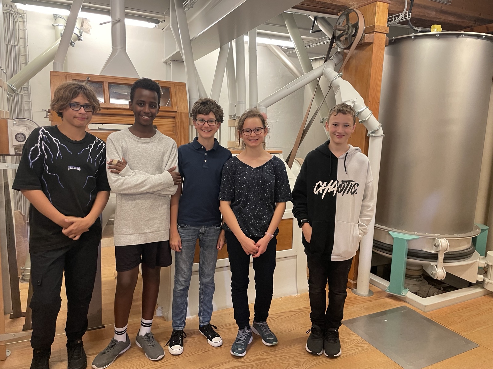 Nach dem Essen liefen wir zur 2 Minuten entfernten Altbachmühle. Die Führung fing vor der Mühle an. Dort empfing uns Herr Tschudi und führte uns in die Mühle. Als erstes erklärte er den Anbau des Getreides und z.B. auch, dass man bei einer Ernte siebeneinhalb Tonnen Weizen ernten kann und 15 Tonnen Mais.